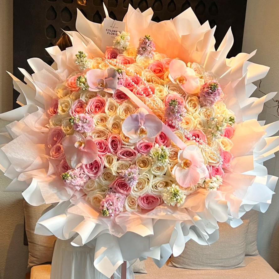 Phalaenopsis, pink roses, cream cup roses, seasonal flowers