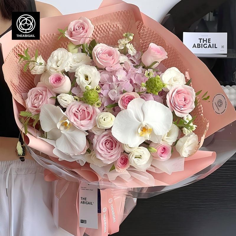 Hydrangea, Phalaenopsis, pink roses, white gentian, seasonal flowers