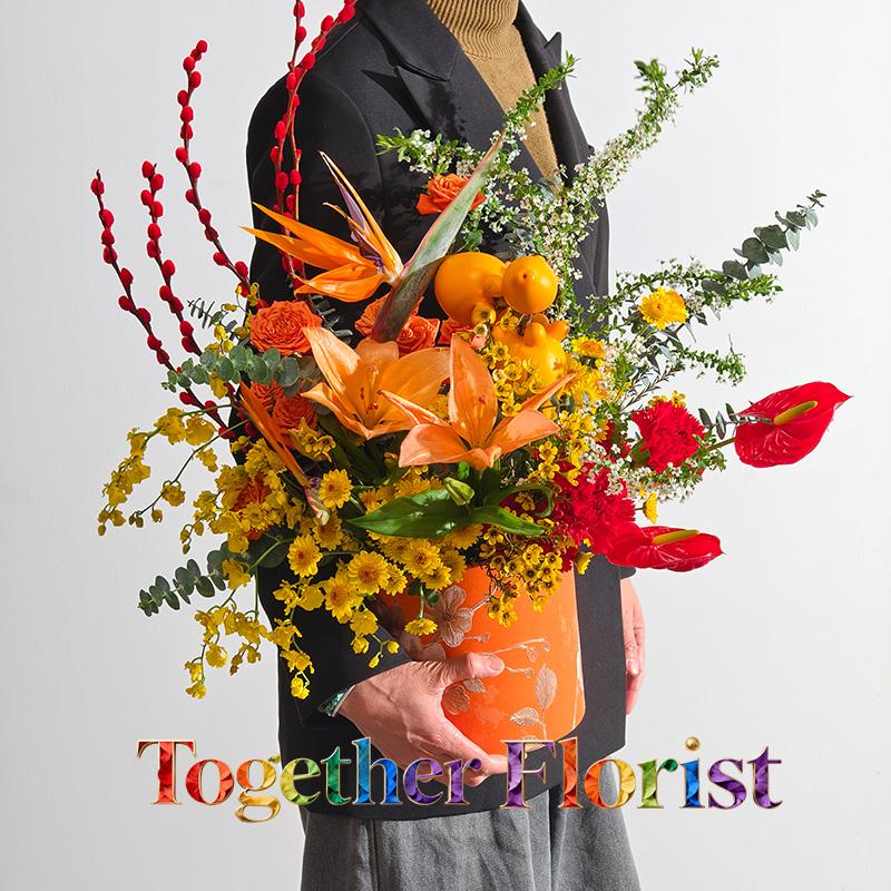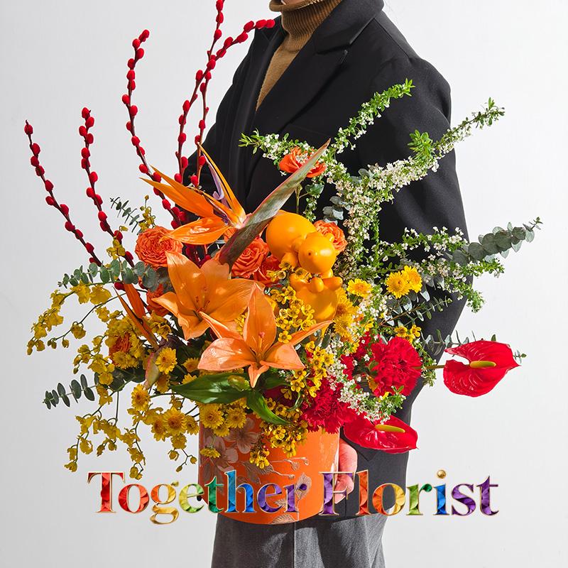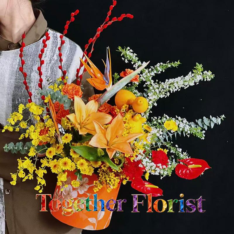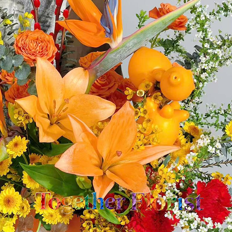 橙色百合,天堂鳥,五代同堂,紅掌,臘梅,小菊,橙色芭比,雪柳,銀柳,跳舞蘭,時令配花