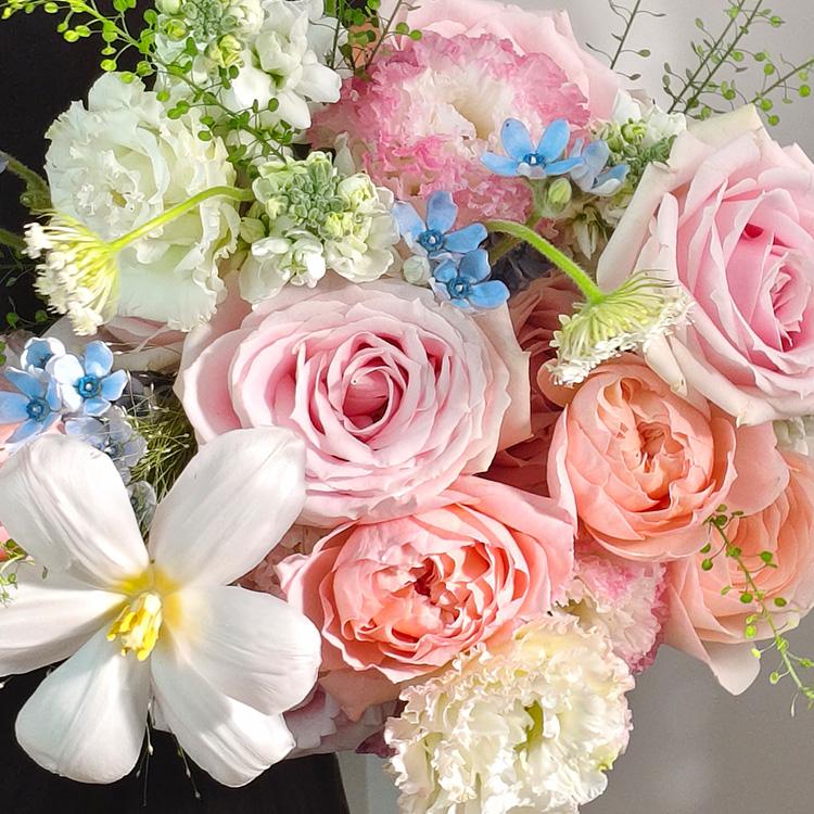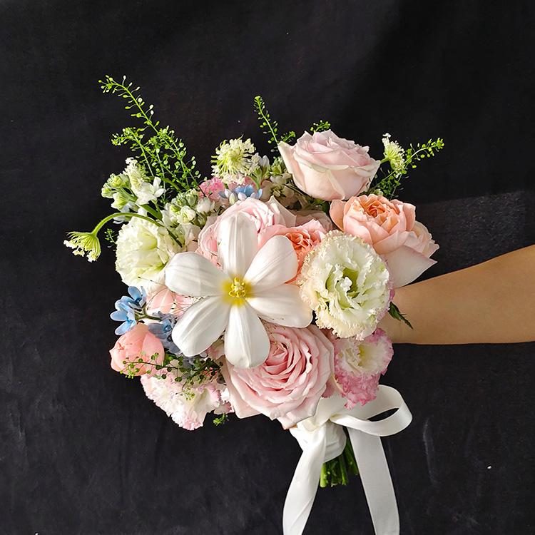 蝴蝶蘭,茱莉亞玫瑰,粉色玫瑰,桔梗,藍星花,時令配花
