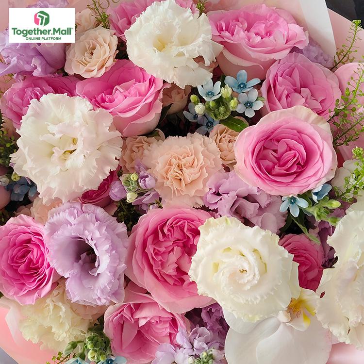 蝴蝶蘭,洛神玫瑰,白色桔梗,紫色桔梗,紫羅蘭,時令配花
