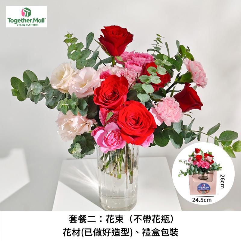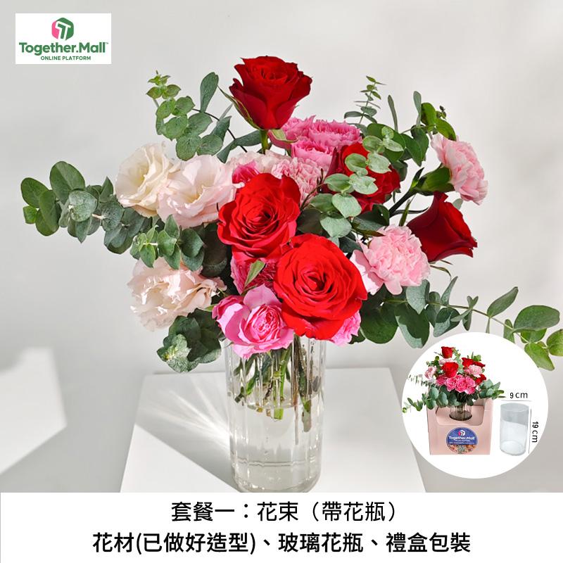 套餐一:花束(帶花瓶)、花材(已做好造型)、玻璃花瓶、禮盒包裝