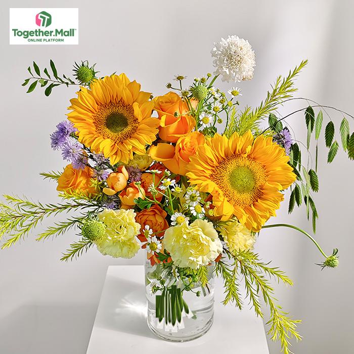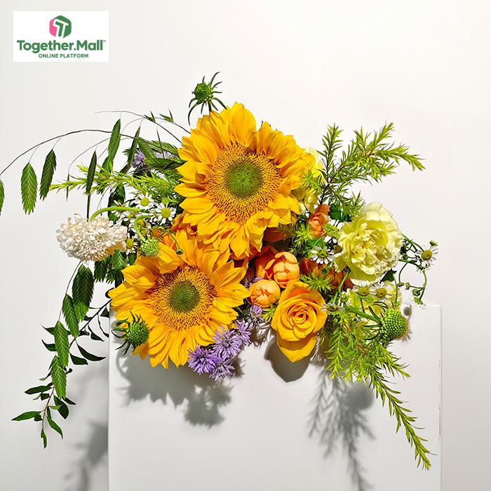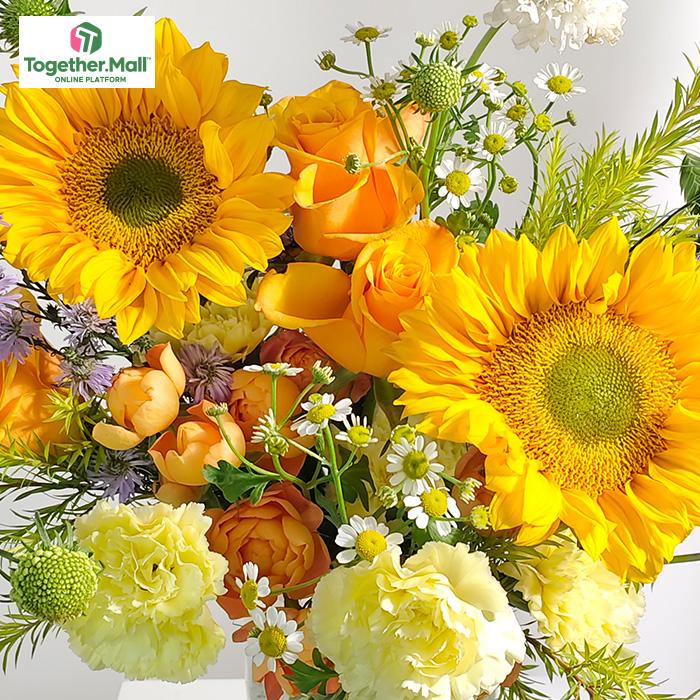 花材:向日葵、輝煌玫瑰、康乃馨、洋甘菊、千層金、時令花材搭配(僅花材,不含花瓶);