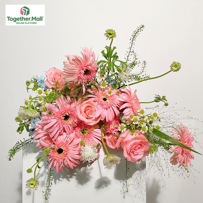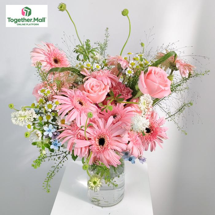 粉色非洲菊、粉玫瑰、翠珠、小翠菊、藍星花、時令配花(僅花材,不含花瓶);