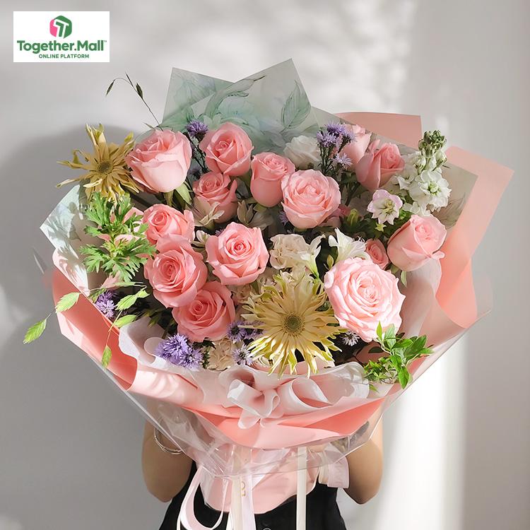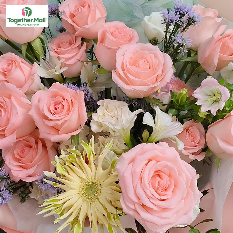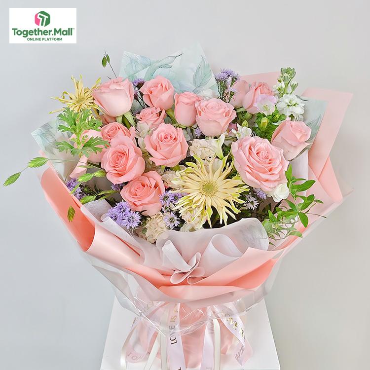 粉色玫瑰、拉絲菊、風鈴花、紫羅蘭、時令配花