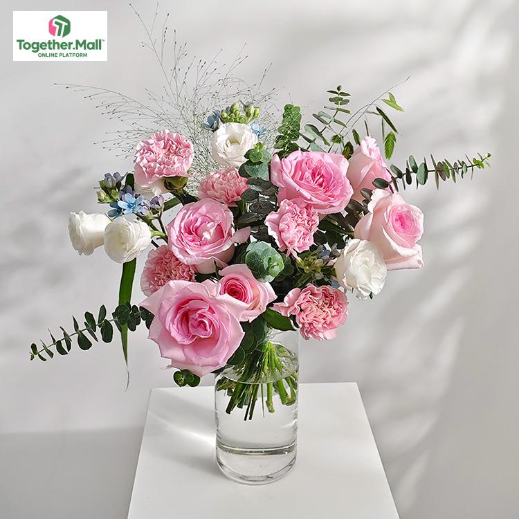 洛神玫瑰,粉色康乃馨,白色桔梗,時令配花(僅花材,不含花瓶);