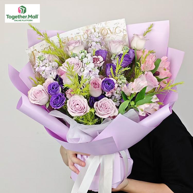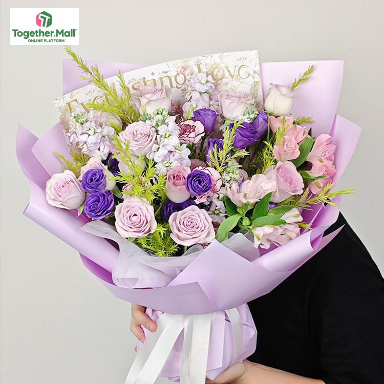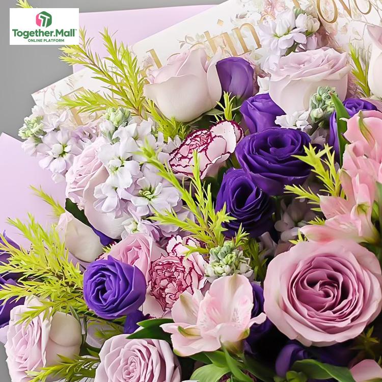 紫精靈康乃馨、紫色玫瑰、紫羅蘭、紫色桔梗、時令配花