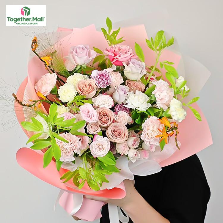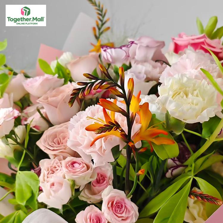 紫精靈康乃馨、白色康乃馨、粉色康乃馨、紫色玫瑰、香檳玫瑰、火焰蘭、時令配花