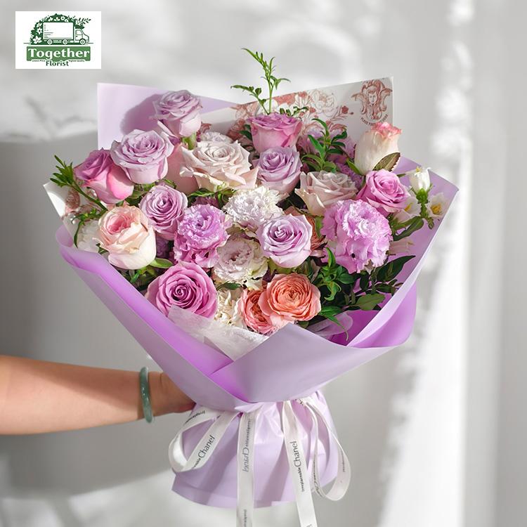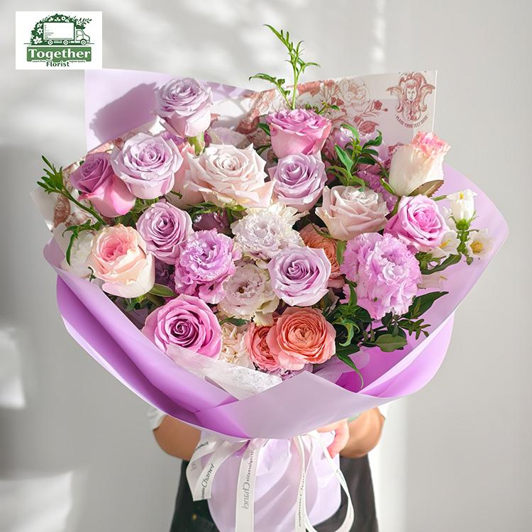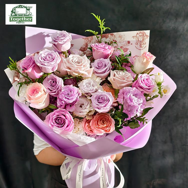 紫色玫瑰,粉色玫瑰,紫色桔梗,風鈴花,時令配花