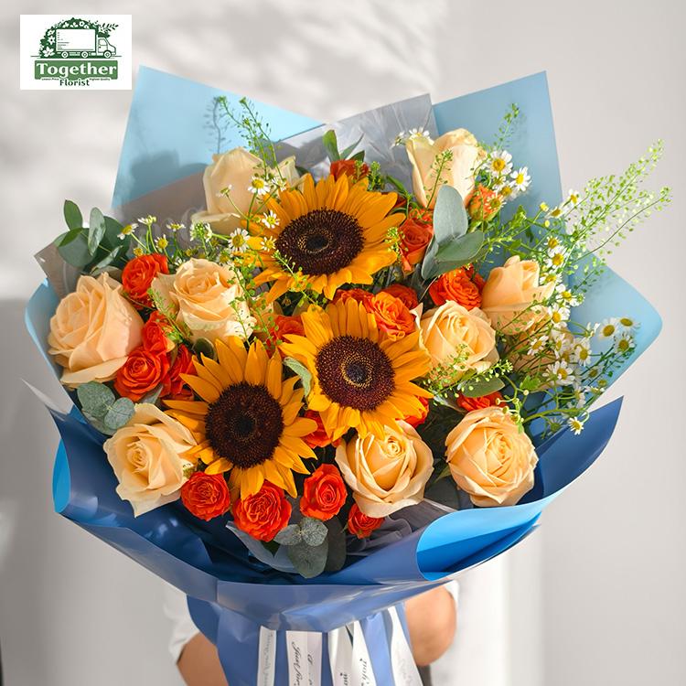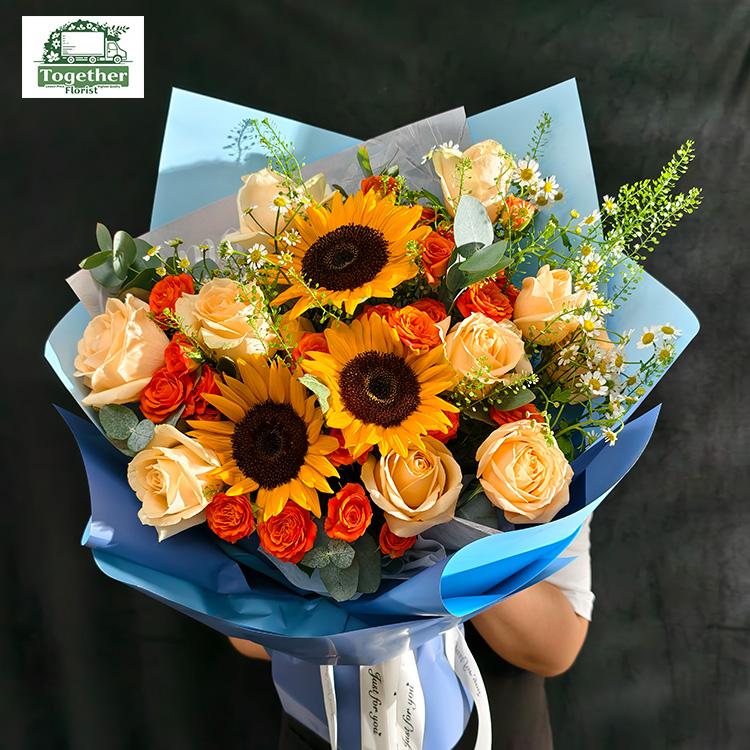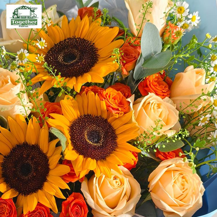 向日葵,香檳玫瑰,橙色多頭玫瑰,時令配花
