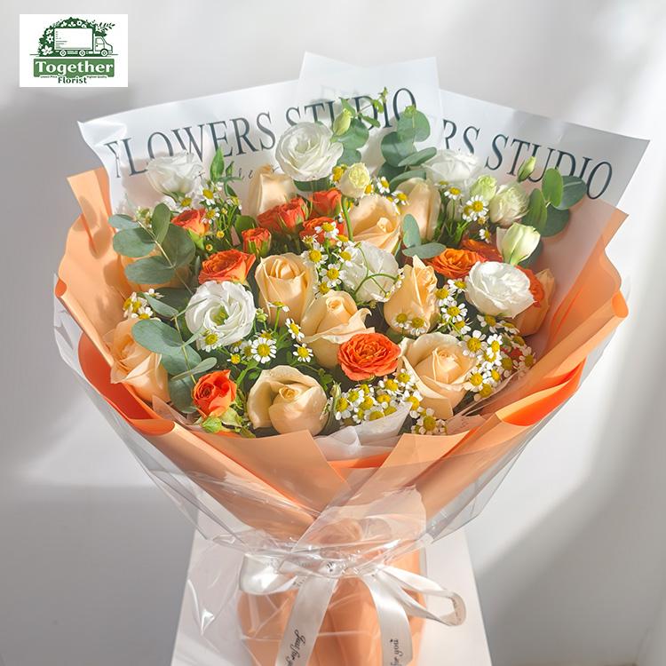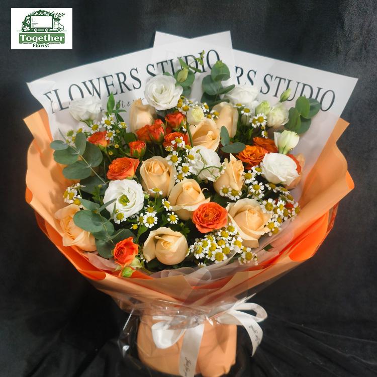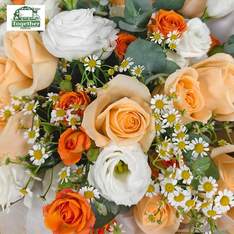 Champagne roses, lisianthus, daisies, orange multi-headed roses, large-leaved eucalyptus, and seasonal filler flowers.