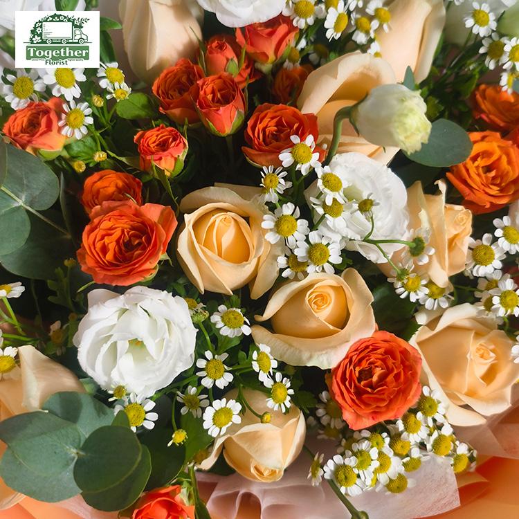 香檳玫瑰、桔梗、雛菊、橙色多頭玫瑰,大葉尤加利、時令配花