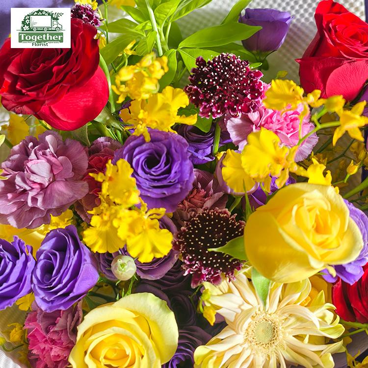 黃色玫瑰、紅色玫瑰、紫色桔梗、紫色康乃馨、拉絲菊、跳舞蘭、松蟲草、時令配花