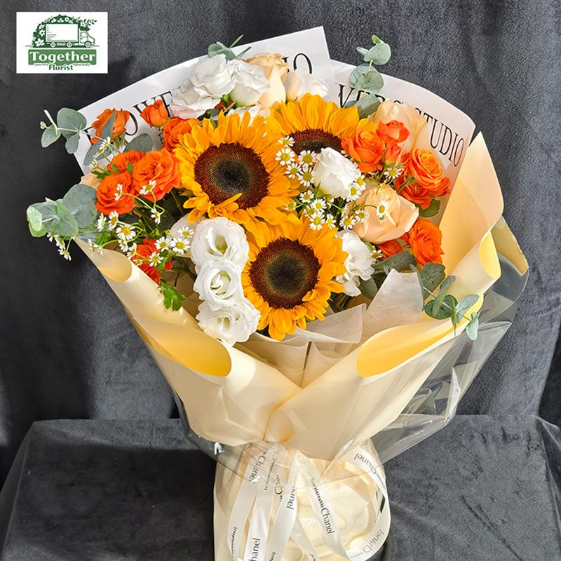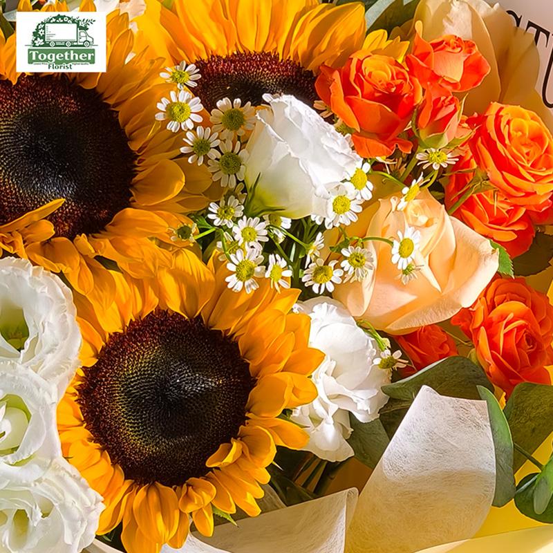 向日葵,香檳玫瑰,多頭玫瑰,桔梗,時令配花