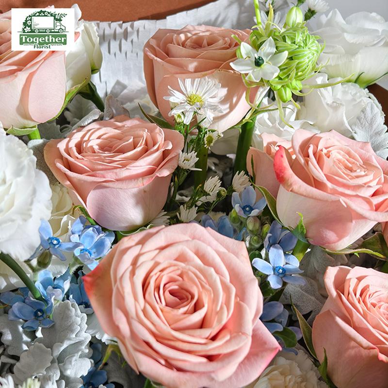 卡布奇諾玫瑰,白色桔梗,藍星花,時令配花