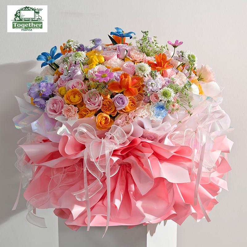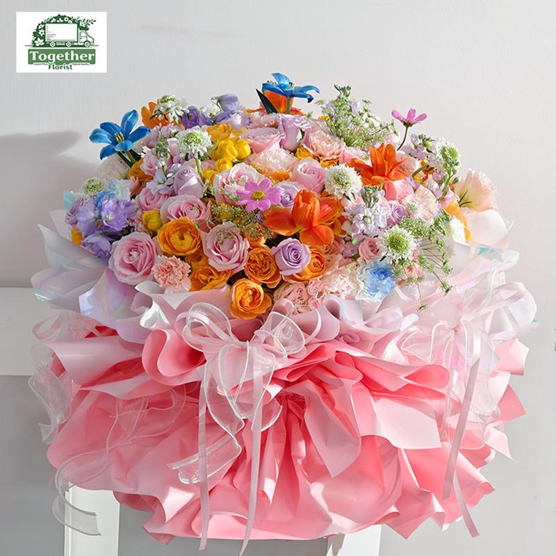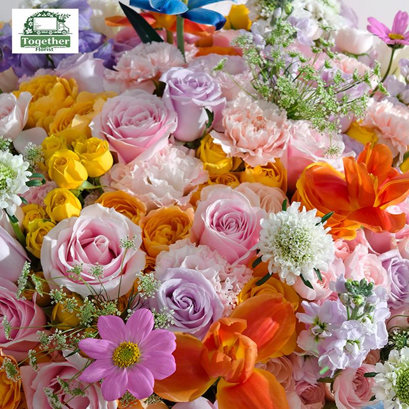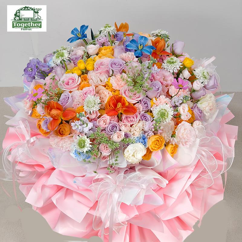 鬱金香,粉色玫瑰,紫色玫瑰,橙色玫瑰,桔梗,紫羅蘭,多頭玫瑰,翠珠,時令配花