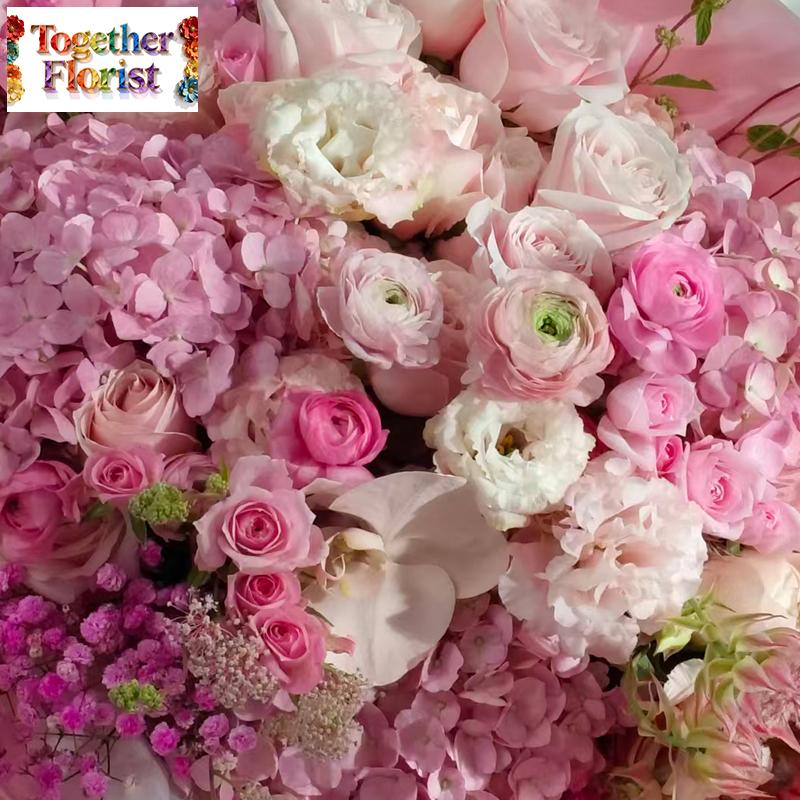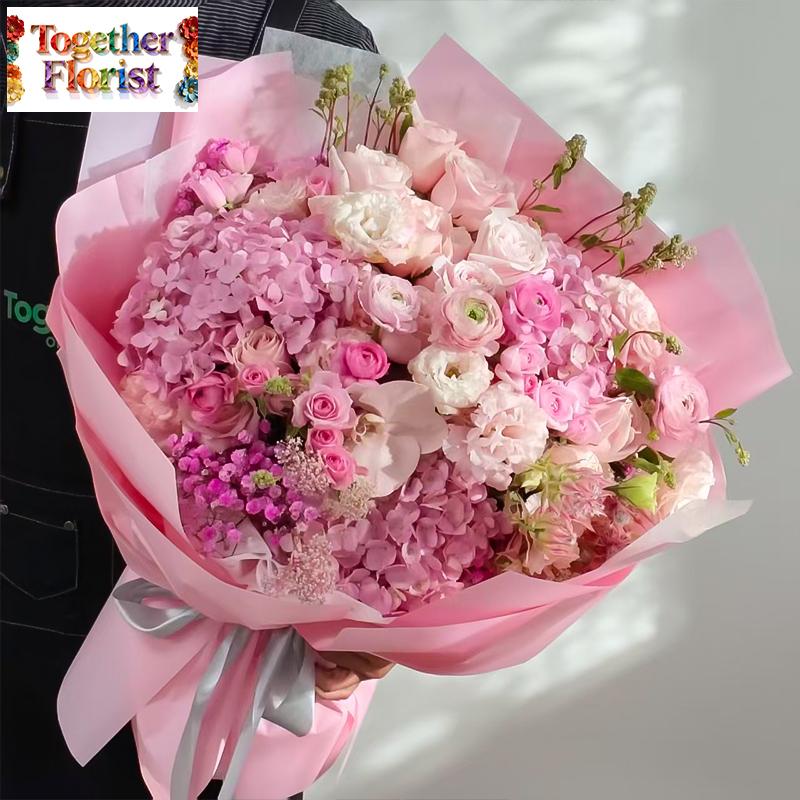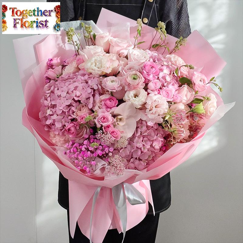 繡球,洋牡丹,蝴蝶蘭,粉色玫瑰,新娘花,桔梗,滿天星,時令配花