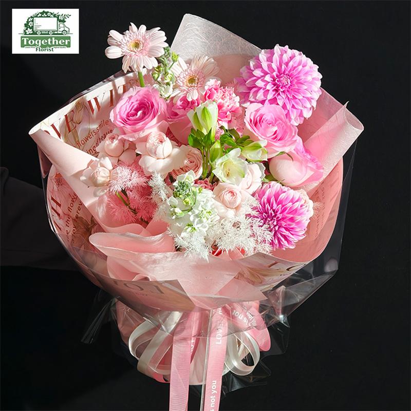大麗花、非洲菊、紫羅蘭、粉色玫瑰、六出花、時令配花