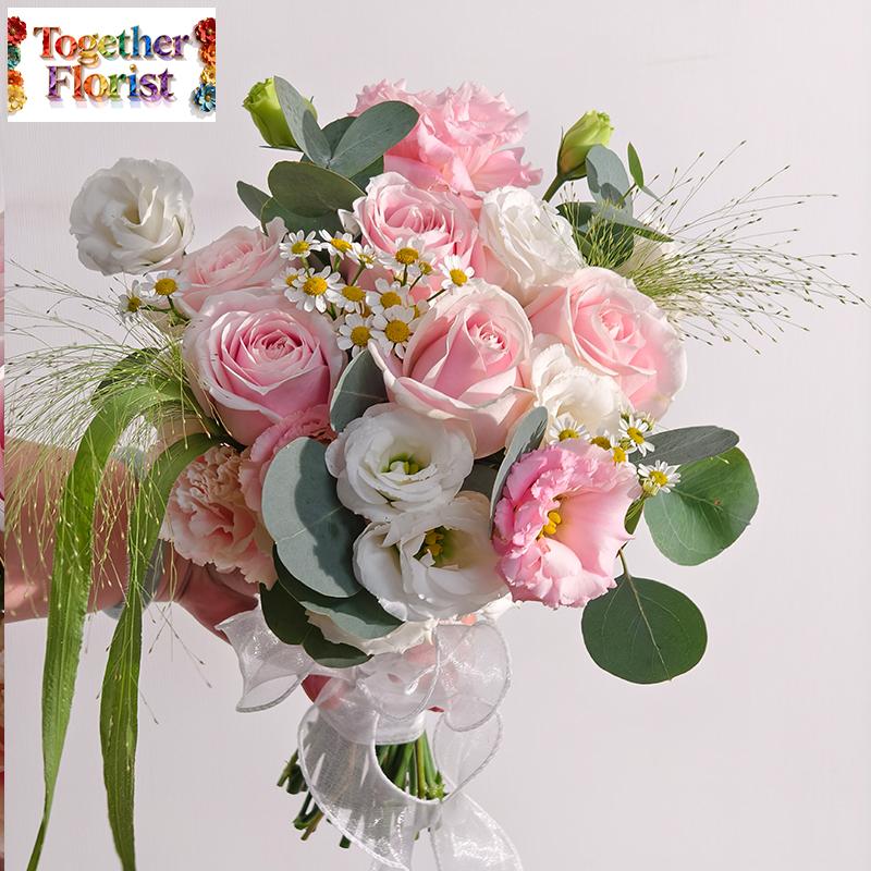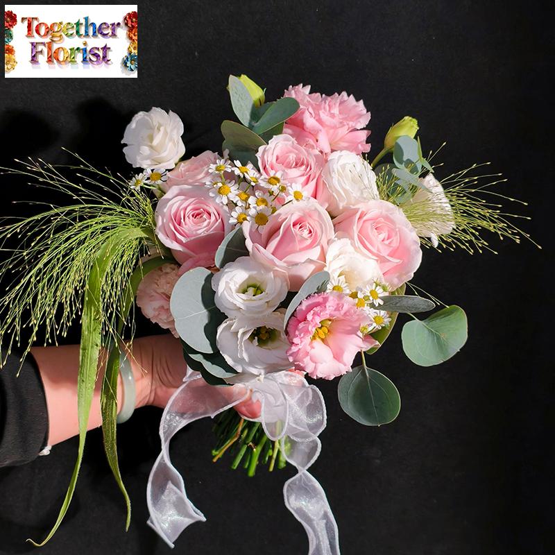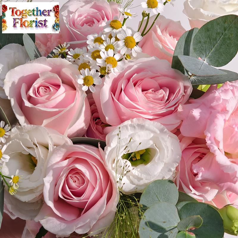 粉色玫瑰,白色桔梗,粉色桔梗,洋甘菊,尤加利葉,噴泉草,時令配花