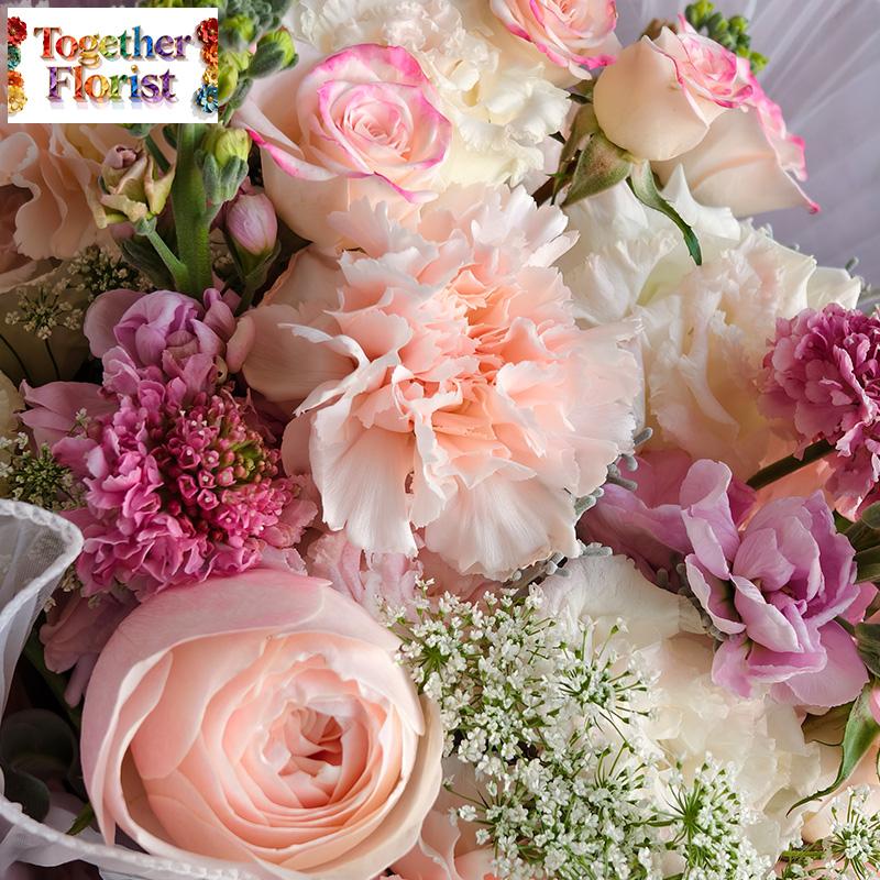 凱瑟琳玫瑰,肉粉桔梗,粉色康乃馨,紫羅蘭,折射多頭玫瑰,時令配花