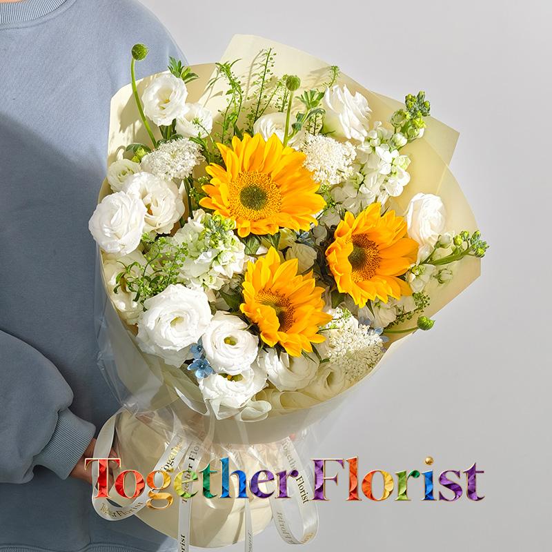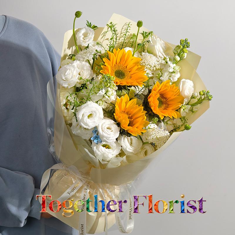 向日葵,白色桔梗,白色紫羅蘭,時令配花