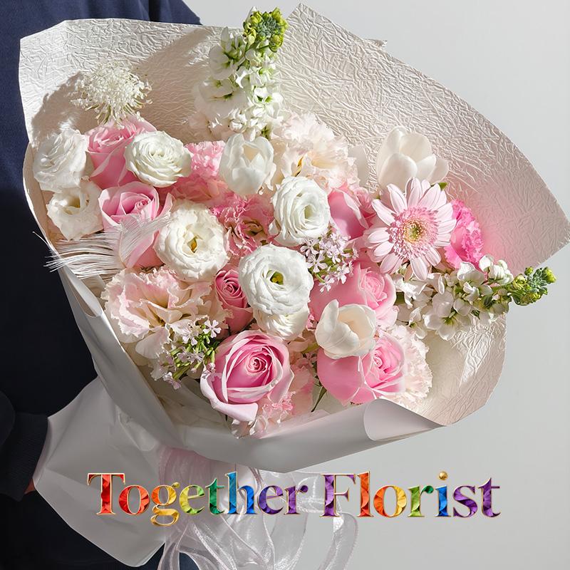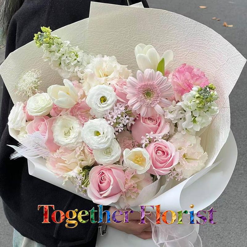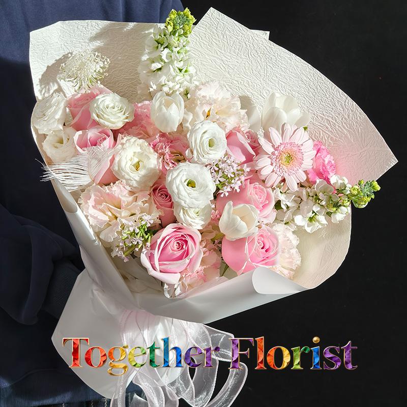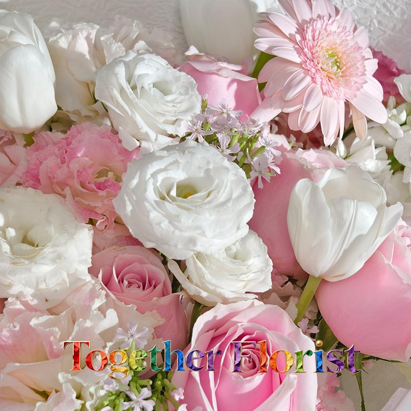 鬱金香,粉色玫瑰,非洲菊,桔梗,紫羅蘭,時令配花