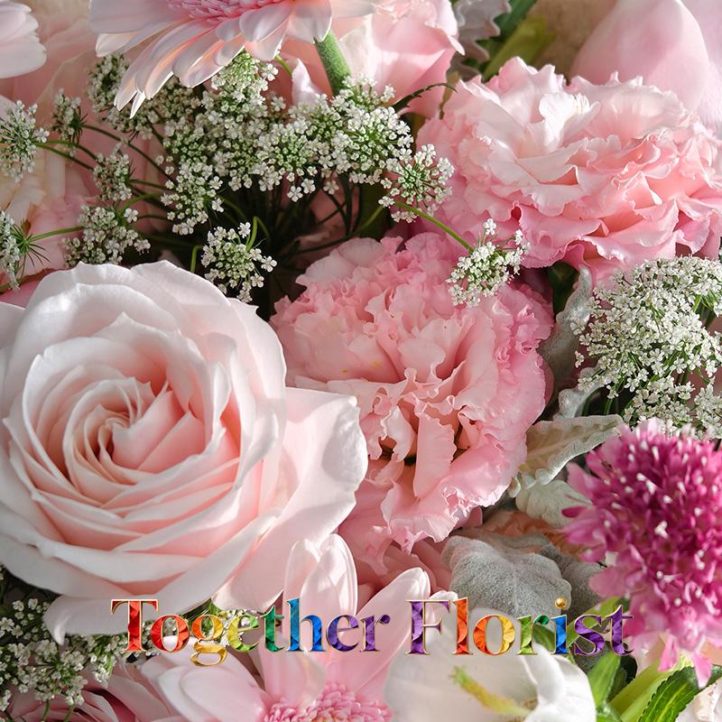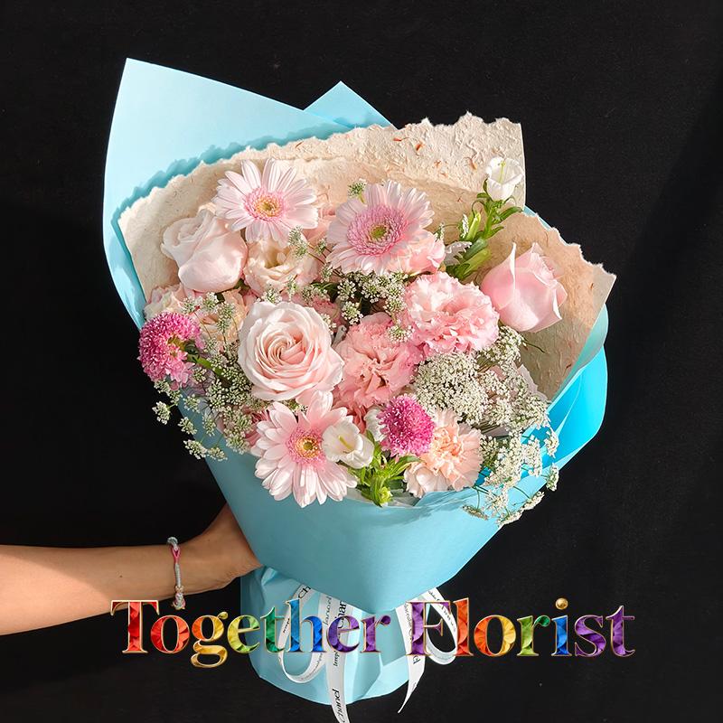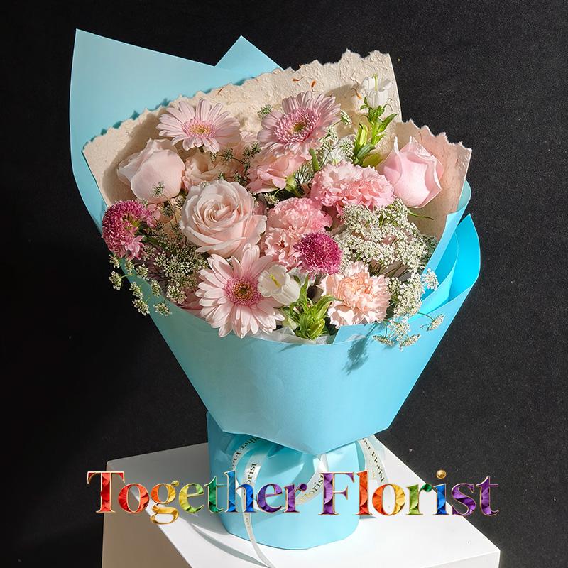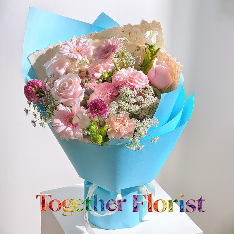 非洲菊,粉色玫瑰,桔梗,康乃馨,風鈴,時令配花