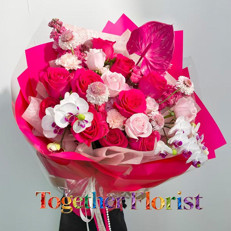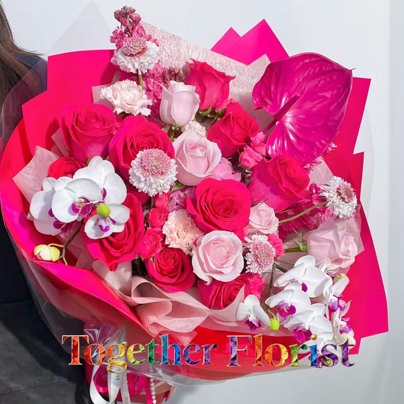 蝴蝶蘭,佛洛依德玫瑰,粉色玫瑰,紅掌,繡球,康乃馨,時令配花