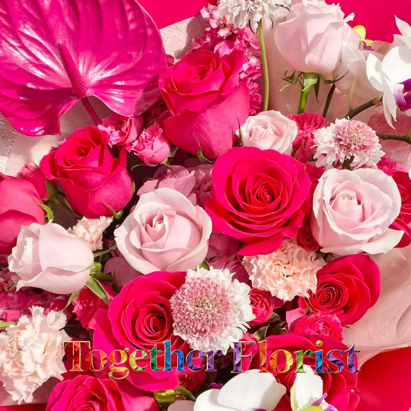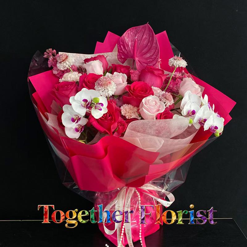 蝴蝶蘭,佛洛依德玫瑰,粉色玫瑰,紅掌,繡球,康乃馨,時令配花
