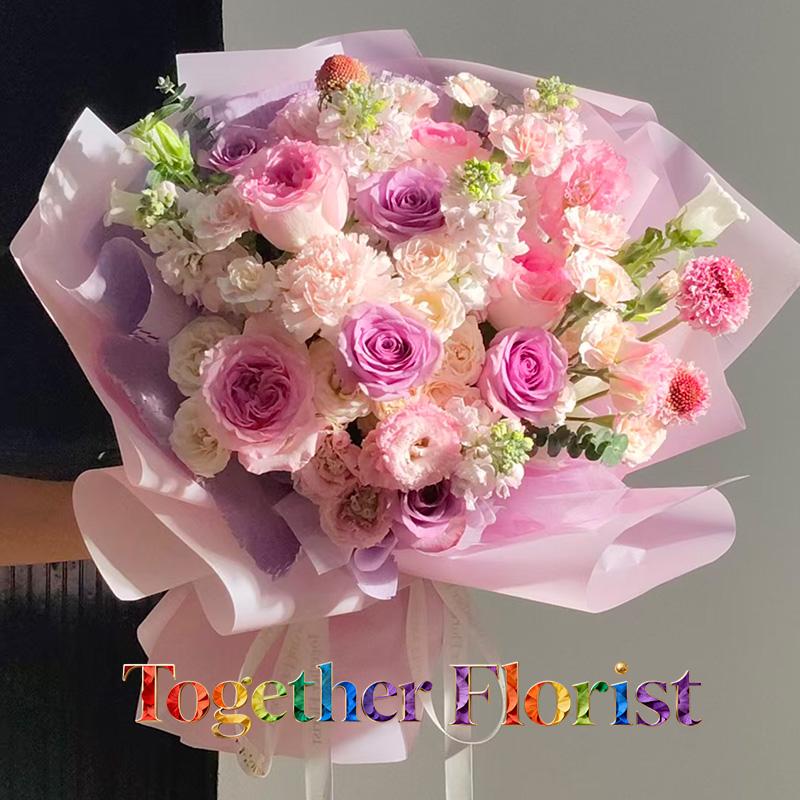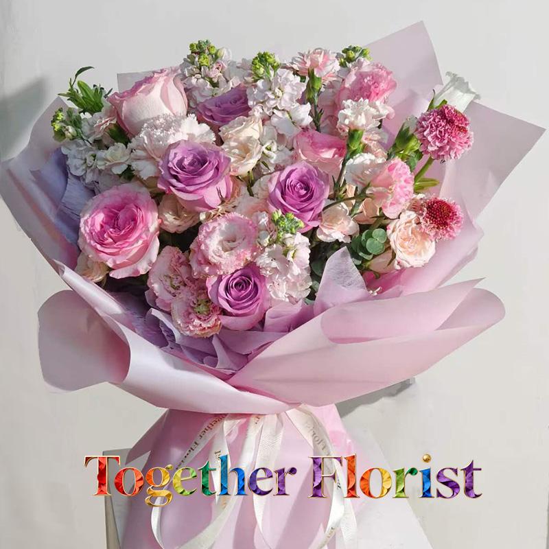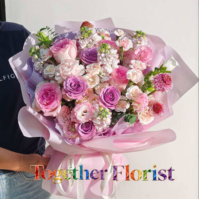 洛神玫瑰,康乃馨,紫羅蘭,風鈴花,紫霞玫瑰,時令配花