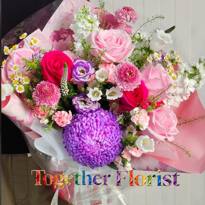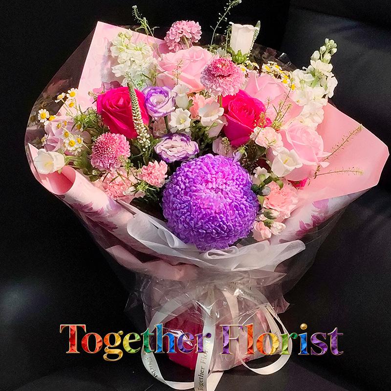 牡丹菊,佛洛依德玫瑰,紫邊桔梗,康乃馨,風鈴,紫羅蘭,時令配花