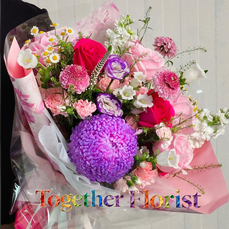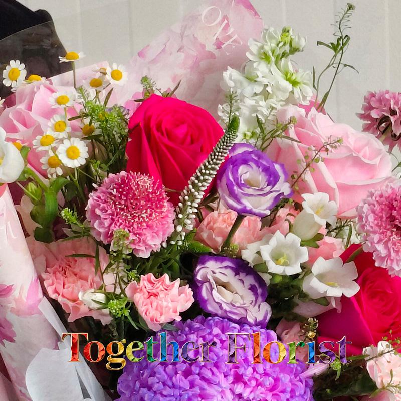 牡丹菊,佛洛依德玫瑰,紫邊桔梗,康乃馨,風鈴,紫羅蘭,時令配花