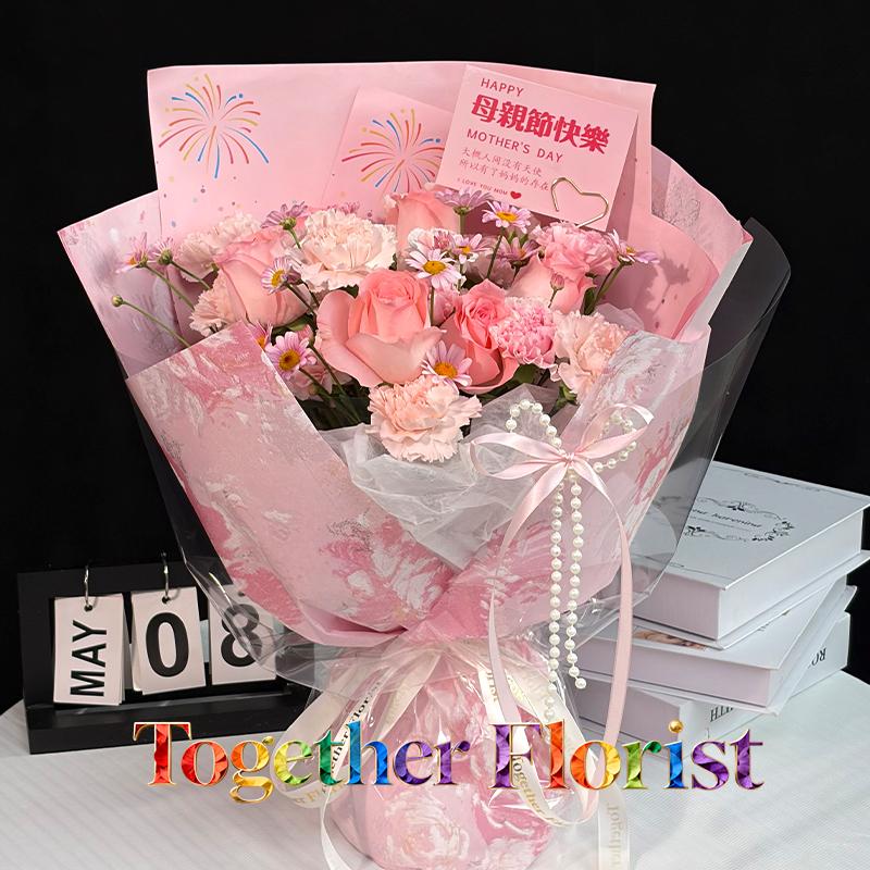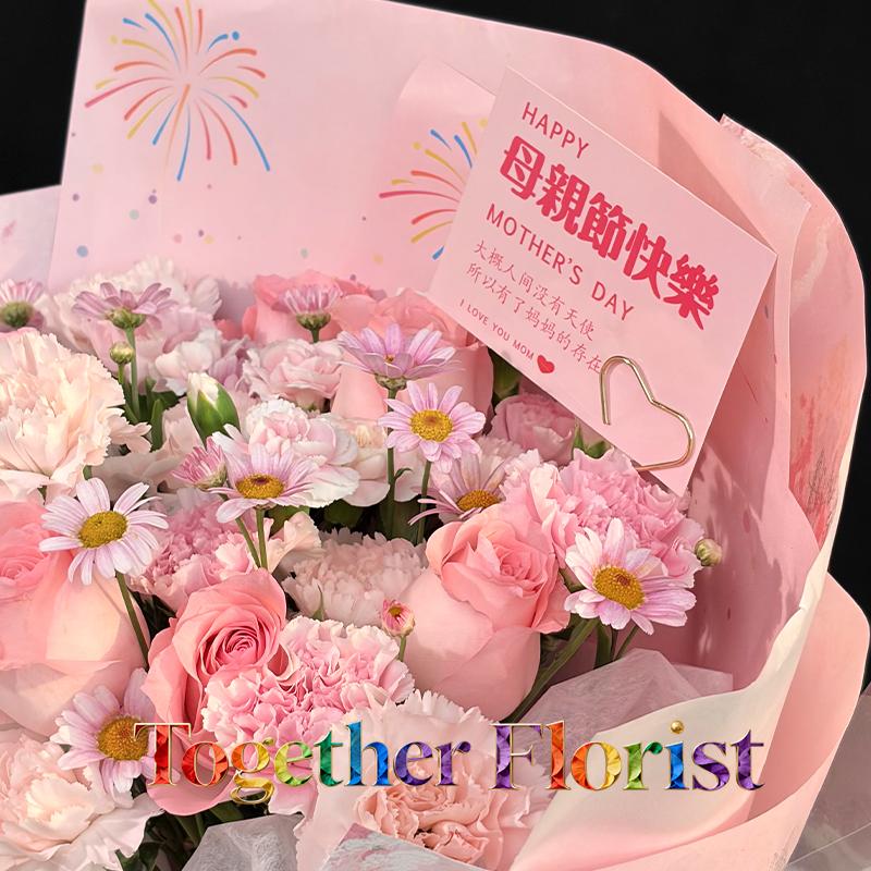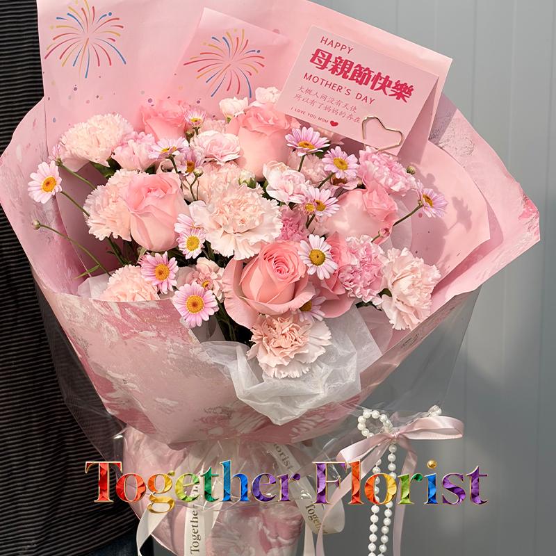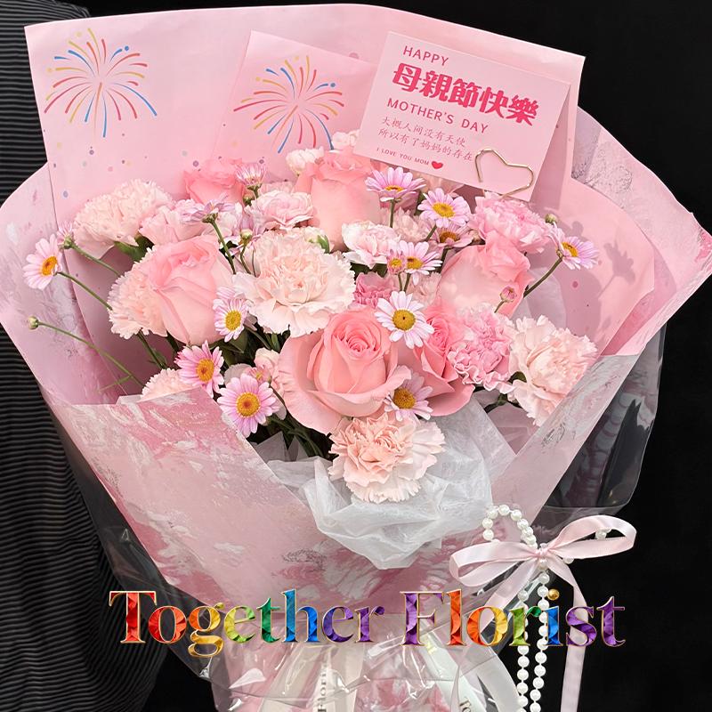 戴安娜玫瑰,流光粉康乃馨,櫻花粉康乃馨,淺粉多頭康乃馨,時令配花
