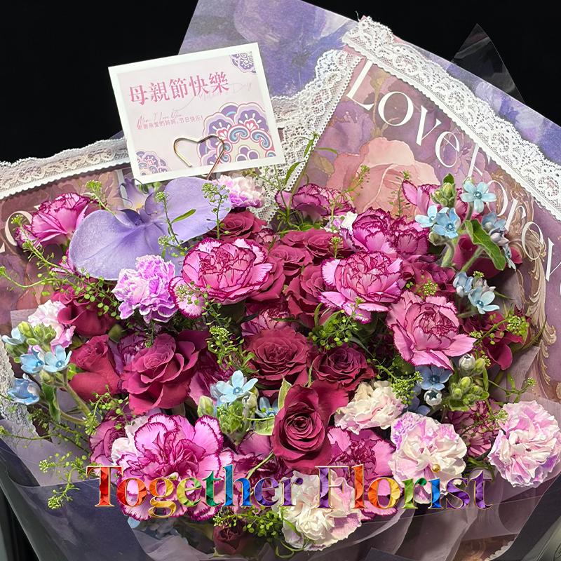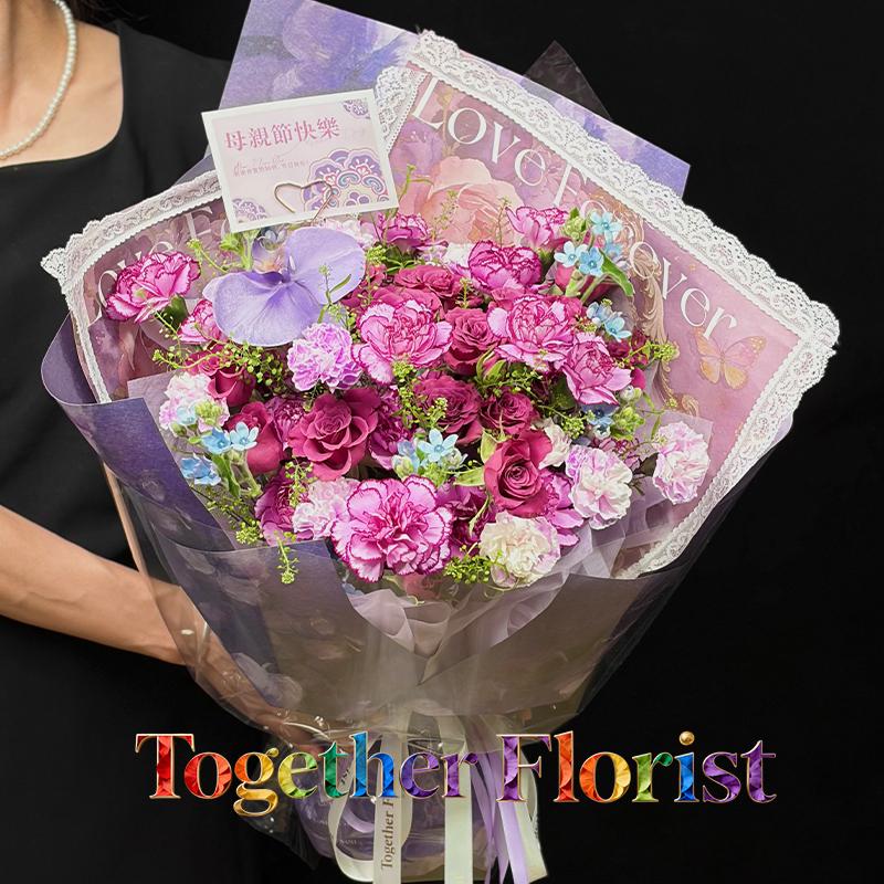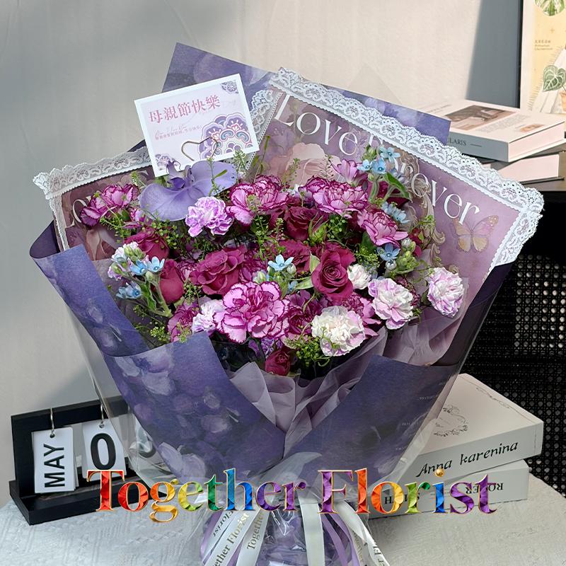 蝴蝶蘭,紫霞康乃馨,藍莓多頭玫瑰,淺紫多頭康乃馨,藍星花,時令配花