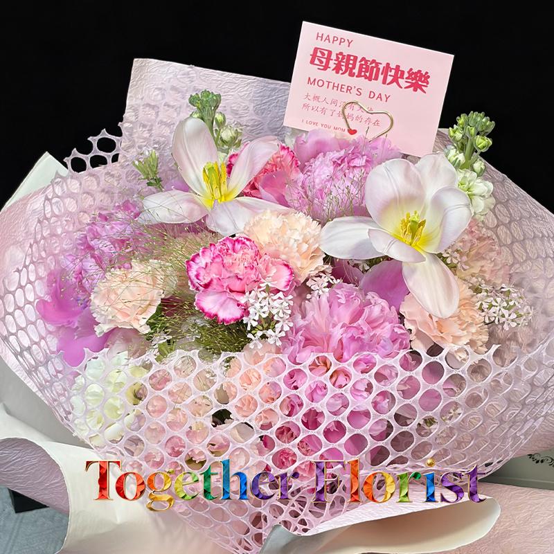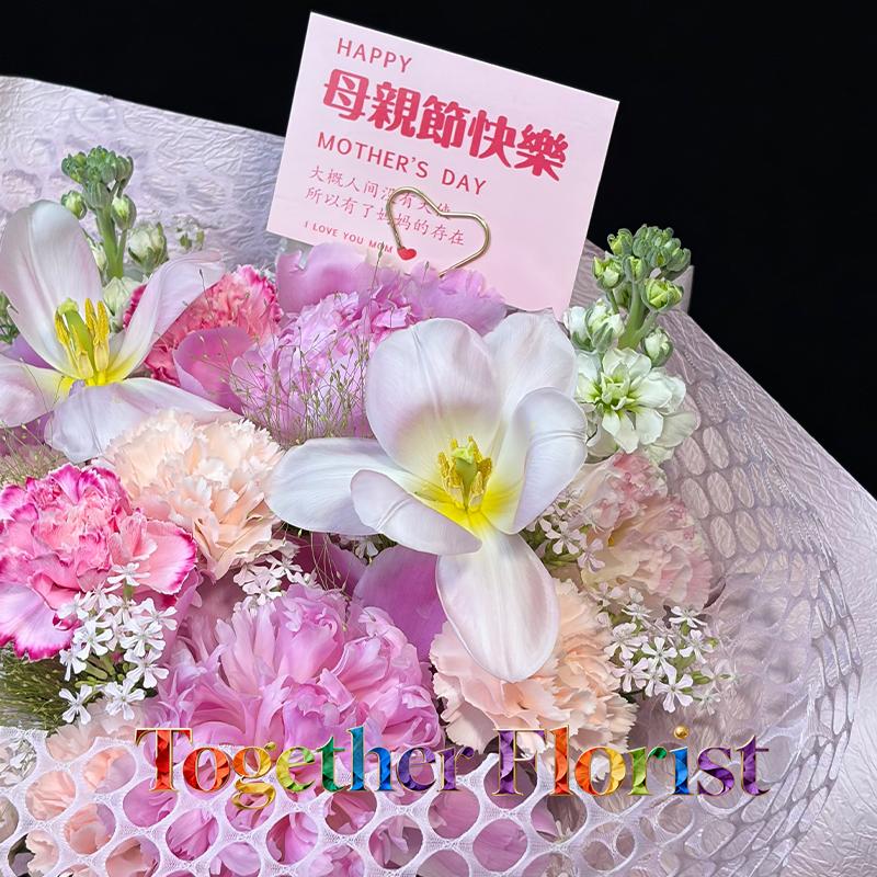 鬱金香,藍富士芍藥,紅色康乃馨,流光粉康乃馨,陽光粉桔梗,白色紫羅蘭,時令配花