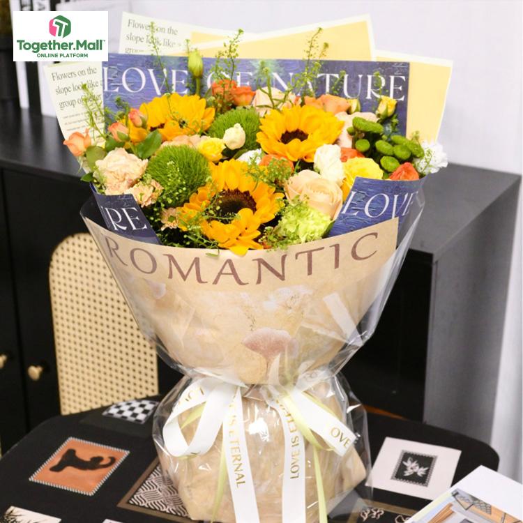 向日葵,香檳色玫瑰,綠毛球,橙色多頭玫瑰,時令配花