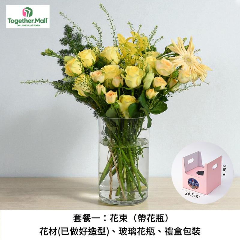 套餐一:花束(帶花瓶)、花材(已做好造型)、花瓶、禮盒包裝