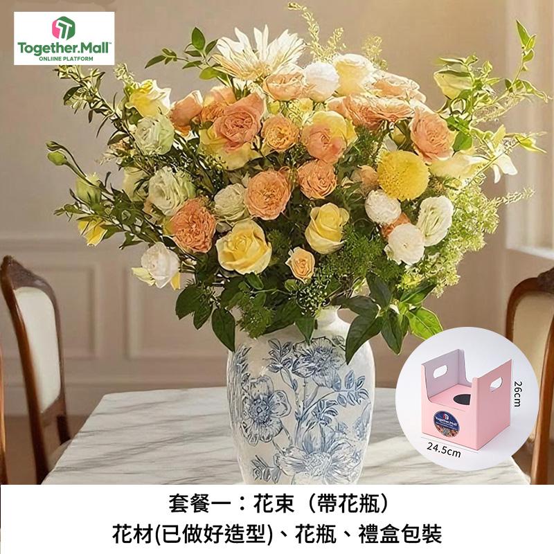 套餐一:花束(帶花瓶)、花材(已做好造型)、花瓶、禮盒包裝