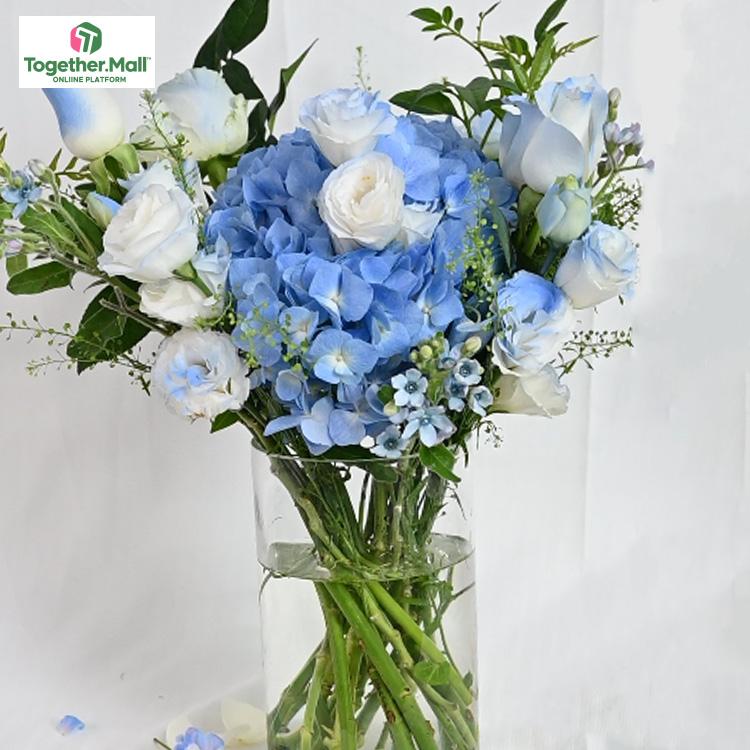 藍色繡球、白色玫瑰、白色桔梗、藍星花、時令配花