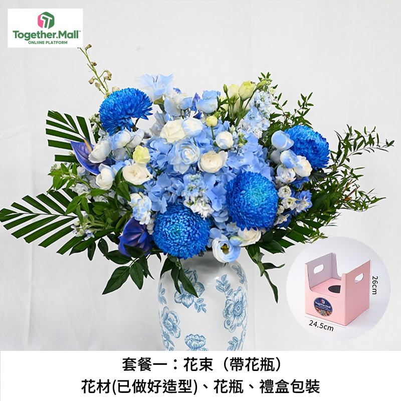套餐一:花束(帶花瓶)、花材(已做好造型)、花瓶、禮盒包裝