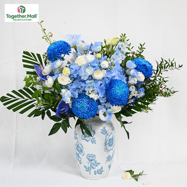 藍色繡球、牡丹菊、白色玫瑰、白色桔梗、藍星花、散尾葉、掌、時令配花