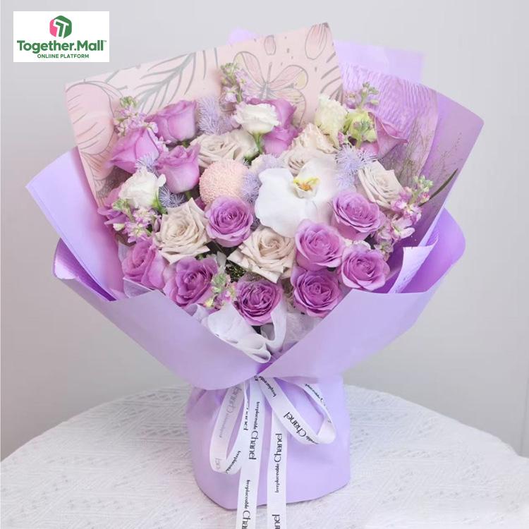 玫瑰、蝴蝶蘭、洋桔梗、乒乓菊、藍星花、噴泉草