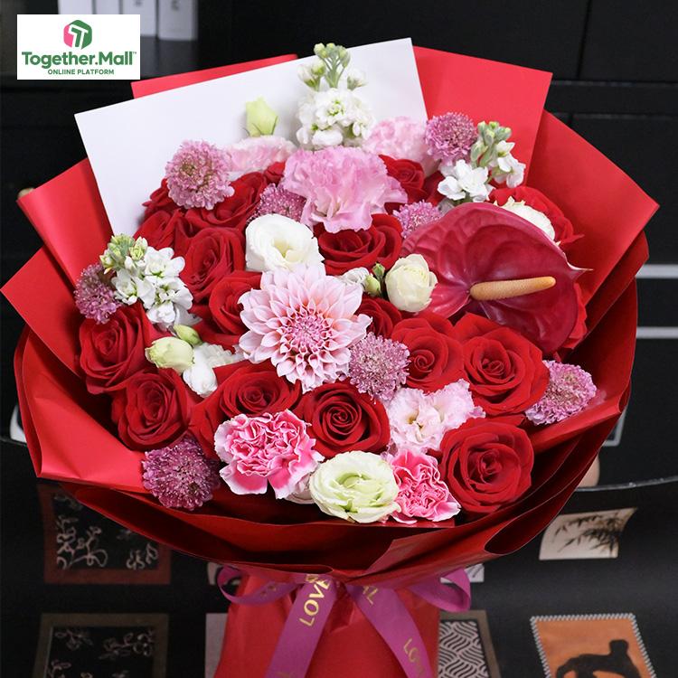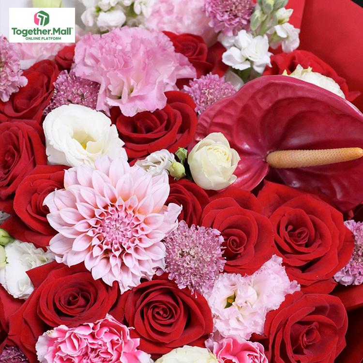 紅色玫瑰,大麗花,洋桔梗,紅掌,時令配花