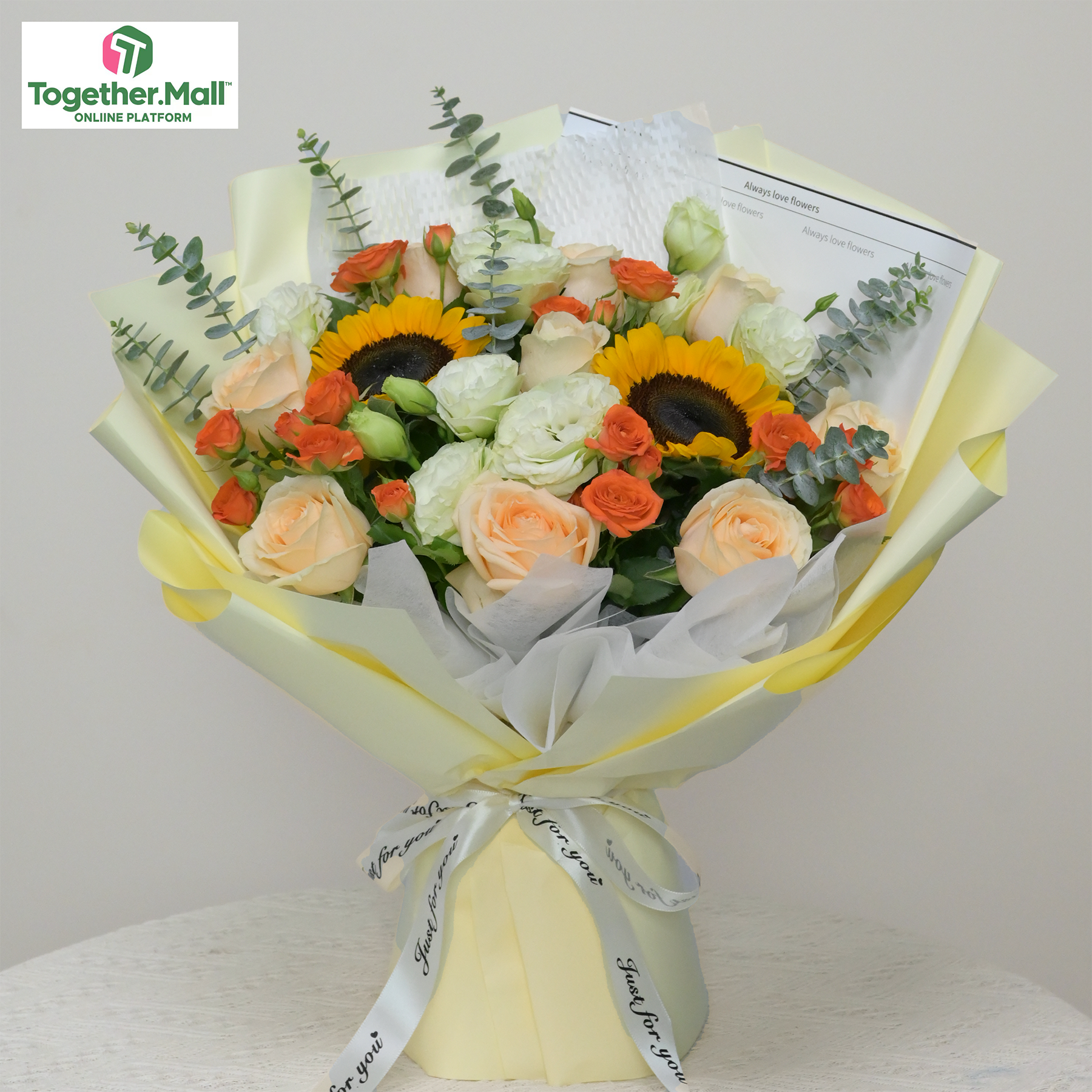 向日葵,香檳玫瑰,桔梗,尤加利葉