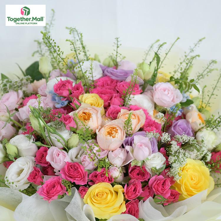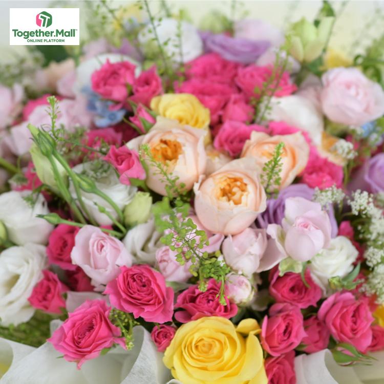紫色玫瑰,黃色玫瑰,白色桔梗,多頭玫瑰,時令配花