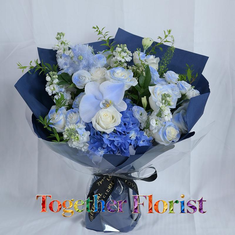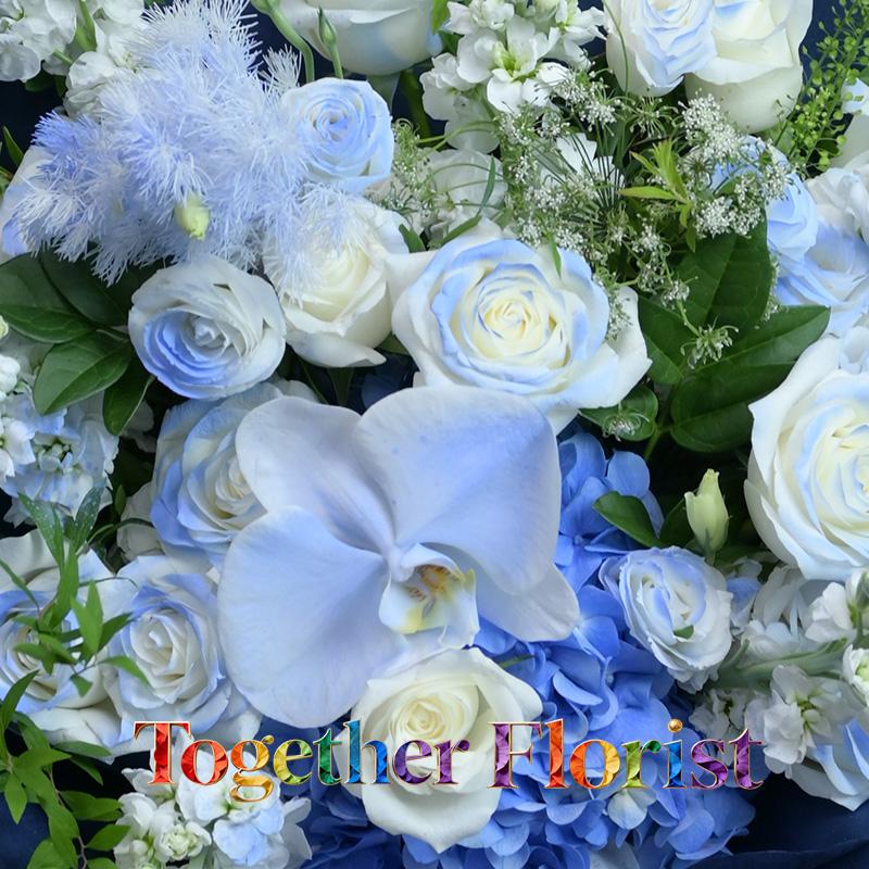 繡球,碎冰藍玫瑰(噴漆),蝴蝶蘭,碎冰藍桔梗(噴漆),時令配花