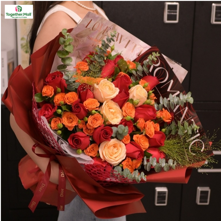 紅色玫瑰,香檳玫瑰,橙色多頭,時令配花