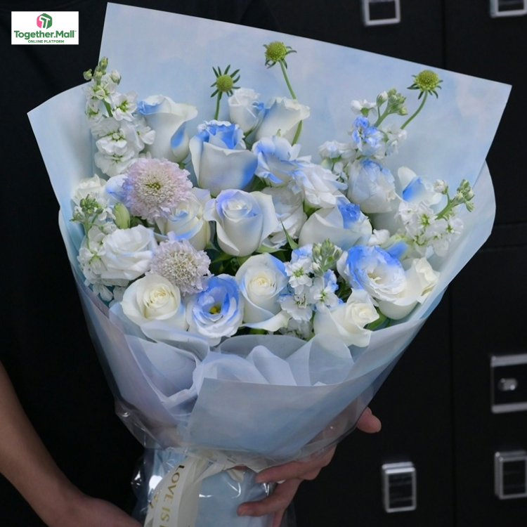 碎冰藍玫瑰(噴色),桔梗(噴色),藍盆花,時令配花