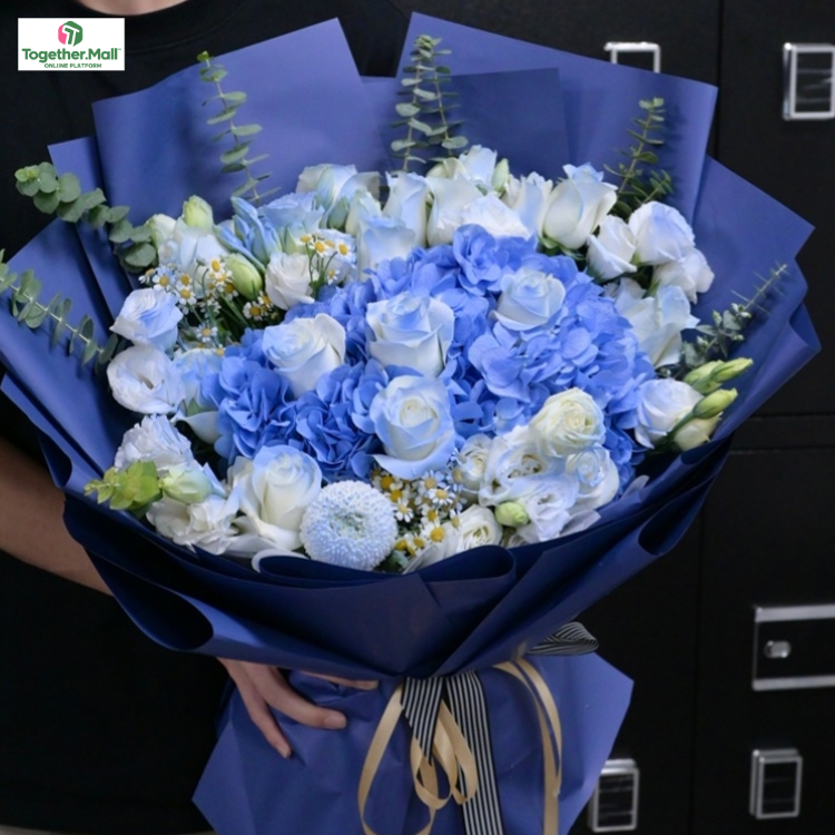 繡球、碎冰藍玫瑰、桔梗、乒乓菊、大葉尤加利、雛菊、時令配花