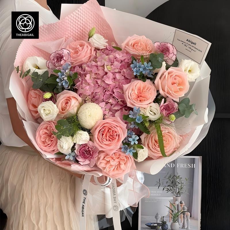 繡球,乒乓菊,粉色玫瑰,康乃馨,白色桔梗,時令配花